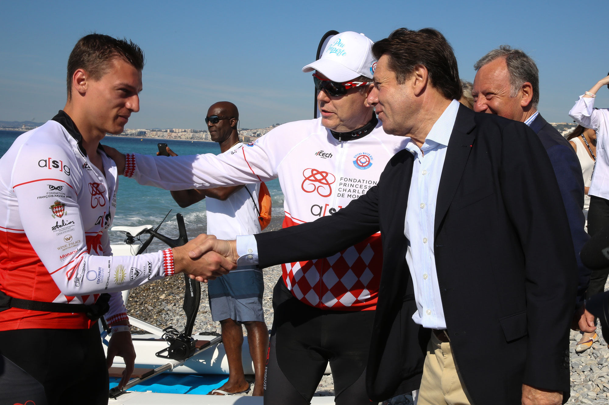 Après être passés les uns après les autres entre les mains d’un préparateur physique depuis 7 heures du matin, et un solide petit déjeuner, les athlètes et leurs co-équipiers -qui pour certains ont gagné leurs places lors du gala organisé par la princesse en mars dernier- sont déposés sur la Promenade des Anglais. L’attentat de Londres ravive en chacun le souvenir de l’attaque qui a frappé, il y a presque un an, ce long et magnifique boulevard bordant la Méditerranée. Un peu avant dix heures, sur la plage Beau Rivage d’où le départ sera donné, le prince arrive. Bientôt rejoint par Christian Estrosi, le maire de Nice. Après les discours d’usage saluant l’initiative de la princesse, Albert II, devant ce parterre d’immenses champions, demande une minute de recueillement en hommage aux victimes, vivantes ou décédées, de Londres. En contrebas de la Promenade, on entend plus en cet instant que le ressac des vagues.