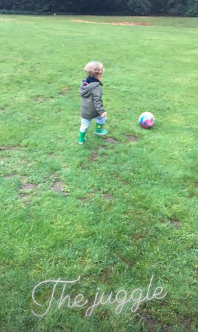 In the final photo, Bear is pictured running in a field with a football, wearing tiny wellie boots and a rain coat, alongside the message: ‘The juggle.’