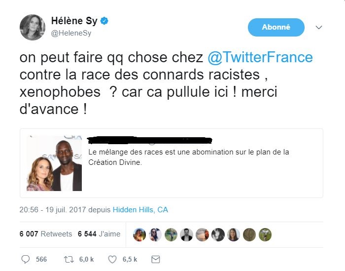Un internaute avait relayé un article portant sur le couple en écrivant “Le mélange des races est une abomination sur le plan de la Création Divine”. Une phrase qui a choqué la mère de famille. La fondatrice et présidente de l’association Cékedubonheur s’est donc saisie de son compte Twitter, non pas pour répondre au twittos, mais pour interpeller le réseau social. Et elle n’a pas mâché ses mots. “On peut faire quelque chose chez Twiter contre la race des conna*** racistes, xénophobes ? Car ça pullule ici ! Merci !”, a écrit Hélène Sy sur le réseau social le 19 juillet dernier avant de rappeler que les conditions d’utilisation de la plateforme condamnent la “conduite haineuse”. On attend de savoir si celle-ci va répondre à l’intéressée.