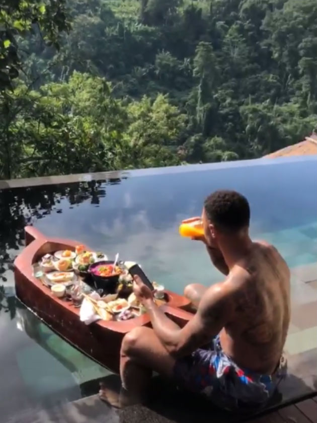 Leigh-Anne, 26 ans, a filmé l'appartement rêveur du couple et a filmé la caméra sur le footballeur Andre. apprécié un verre et mordre à manger dans une piscine surplombant un paysage magnifique.
