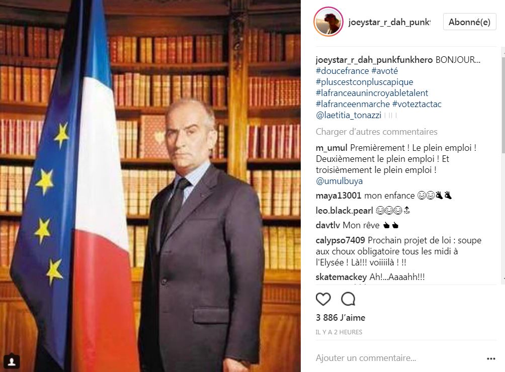 Sur Instagram et à sa manière, JoeyStarr est revenu ce lundi 16 octobre sur l’intervention télévisée d’Emmanuel Macron. Le rappeur a posté un cliché de Louis de Funès grimé en président de la République. La parodie met en scène le comédien sur une photo officielle posant aux côtés des drapeaux français et européen. Si ce cliché rappelle la photo officielle de Nicolas Sarkozy, c’est bien l’actuel président que JoeyStarr vise. Parmi les hashtags que l’artiste a mentionnés en légende de son post, les internautes peuvent lire ” #laFranceenmarche “, du nom du mouvement d’Emmanuel Macron pendant la campagne présidentielle. Faisant régulièrement le buzz sur Instagram pour ses publications, le comédien semble récolter cette fois-ci tous les suffrages.
