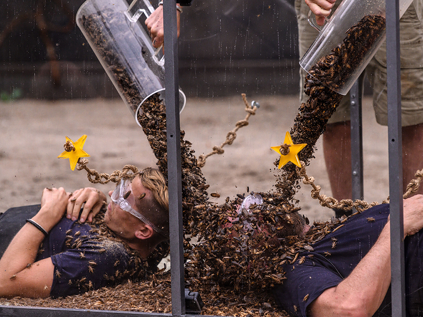 As the brave celebs lied on their backs in a cage, 5kgs of mealworms, 5000 crickets, 5000 cockroaches, 20 scorpions and 20 large spiders were poured onto them as they tried to undo a load of knots and release some stars.