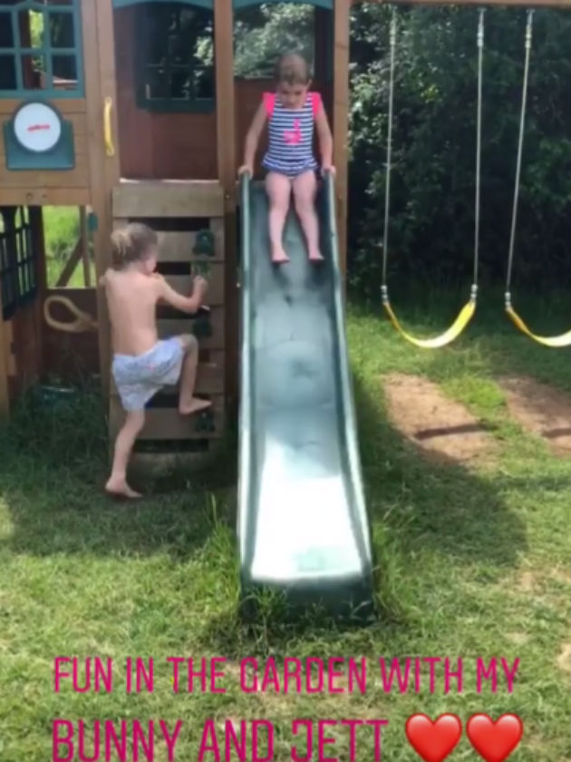 Katie, 40 ans, filmée ses deux plus jeunes enfants - qu'elle partage avec son ex-mari Kieran Hayler - jouant sur des balançoires et un grand toboggan dans le jardin avant que Jett ne crie qu'il voulait aller dans le bain à remous.