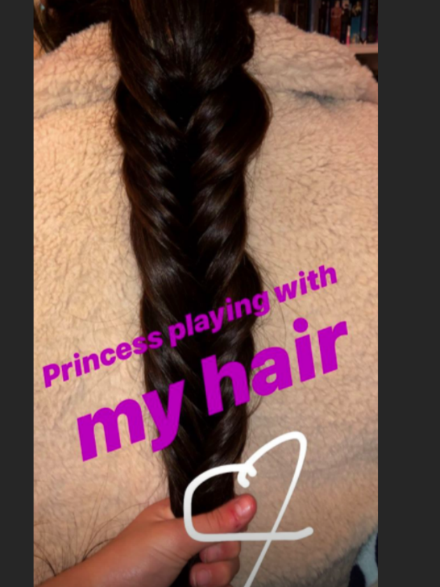 ‘Princess playing with my hair,’ she wrote across the pictured shared to her 1.9 million followers on her Instagram story.