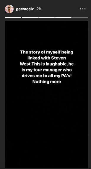 ". L’histoire de moi-même liée à Steven West . C’est risible, c’est mon directeur de tournée qui m’amène à tous mes PA! Rien de plus », a-t-elle déclaré.