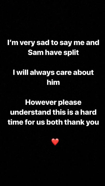 Quelques minutes plus tard, Georgia, 20 ans, a invoqué Instagram Stories pour dire: 'Je' Je suis très triste de dire que Sam et moi sommes séparés. Je me soucierai toujours de lui, mais comprenez bien que nous vivons dans une période difficile, merci. "