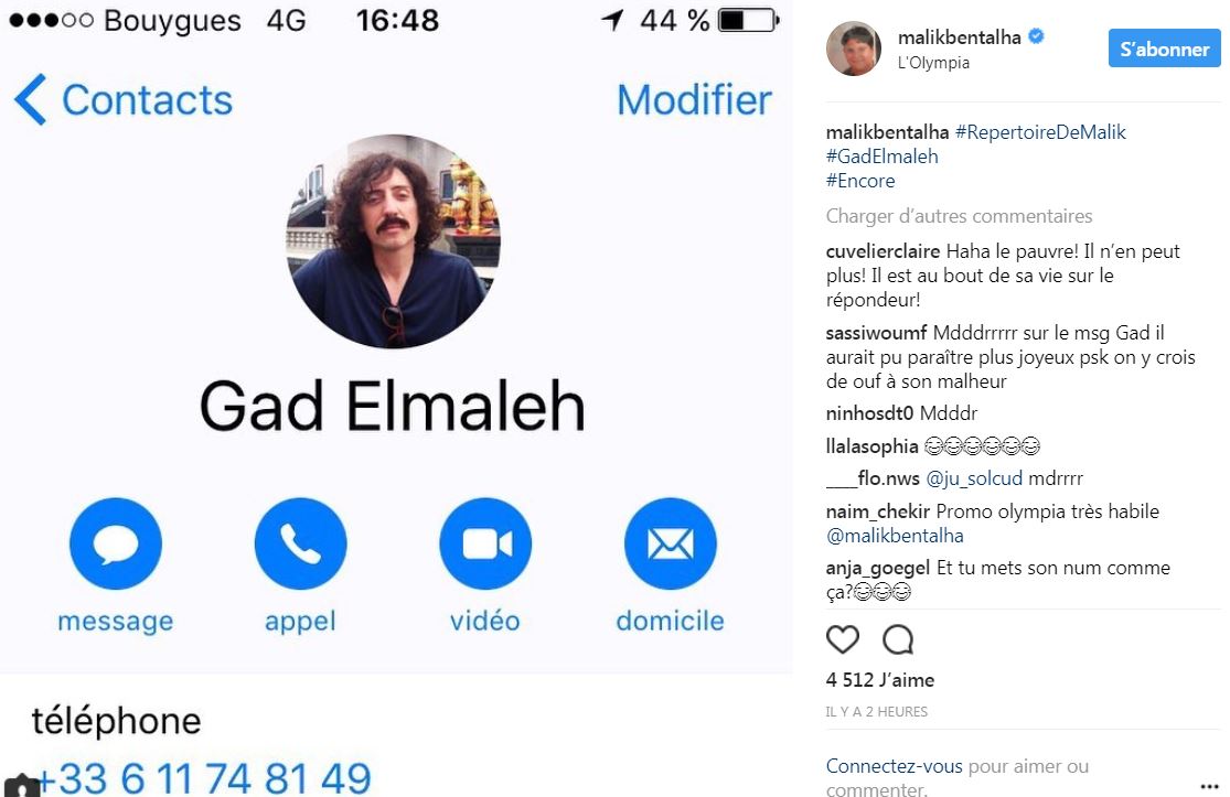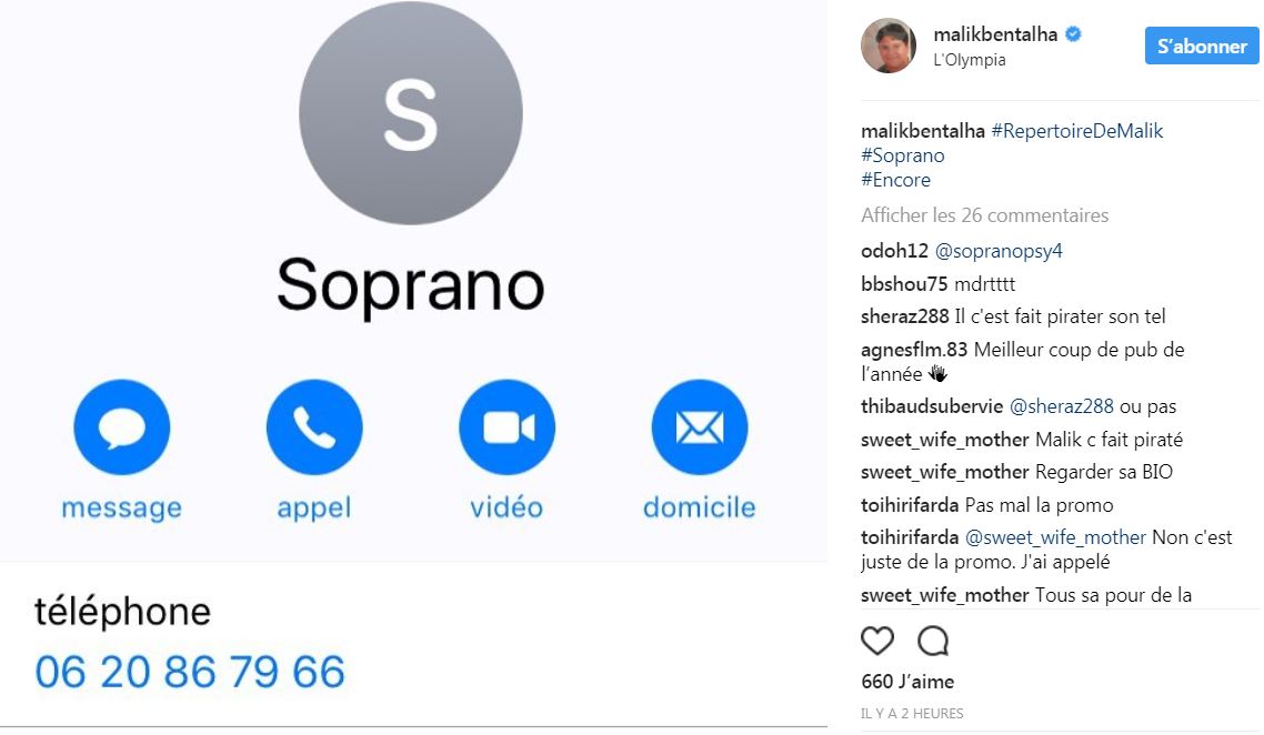 Outre ces clichés somme toute assez innocents, l’indivu qui a hacké le compte de Malik Bentalha n’a pas hésité à publier les numéros privés de grandes stars française. Sur Instagram, il a ainsi publié des captures d’écran du répertoire de l’humoriste, dans lequel se trouvait les numéros de Gad Elmaleh, MHD, Tony Yoka, Matt Pokora, Soprano ou encore DJ Snake. Plusieurs heures après les faits, Malik Bentalha n’a cependant toujours pas pris la parole sur ce regrettable incident. Invité sur le plateau de Touche Pas à Mon Poste ce mardi, ce n’est cependant pas exclu qu’il le fasse auprès de Cyril Hanouna. Après tout, étant donné la présence du hashtag “#Encore” (le nom de son spectacle) sur les publications, peut-être s’agit-il simplement d’un canular de l’humoriste…