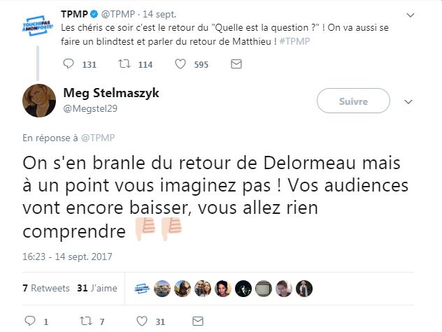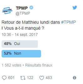 Une question qui divise également profondément la Toile. Jeudi 14 septembre 2017, le compte officiel de TPMP a annoncé le retour de l’ancien chroniqueur sur Twitter : “Salut les chéris ! Petit tweet matinal pour vous prévenir que notre Matthieu Delormeau revient nous voir autour de la table lundi”. Une nouvelle qui divise profondément les fanzouzes. Il faut dire que Matthieu Delormeau a un caractère bien trempé. Le chroniqueur est soit admiré, soit détesté. D’ailleurs d’après un sondage lancé par l’émission, 52% des téléspectateurs seraient contre le retour de Matthieu Delormeau : “Ton public voit aujourd’hui ton vrai visage : tu n’es pas un homme de valeur et de respect. Accepter le retour de Delormeau est indigne. Bon vent.”, “On s’en branle du retour de Delormeau mais à un point vous n’imaginez pas ! Vos audiences vont encore baisser, vous n’allez rien comprendre”. Mais certains téléspectateurs se réjouissent : “Objectivement parlant, Delormeau avait dans TPMP des avis pertinents, argumentés et très pro. Dire le contraire n’est pas objectif…” Une chose est sûre : l’émission de ce lundi risque d’être mouvementée !