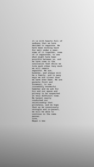 «Nous n’avons pas vraiment conduit notre relation aussi en privé, et nous espérons que lorsque nous découplerons et co-parents consciemment, pouvoir continuer de la même manière. '