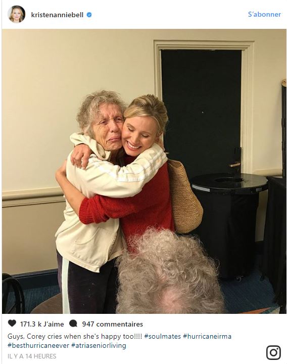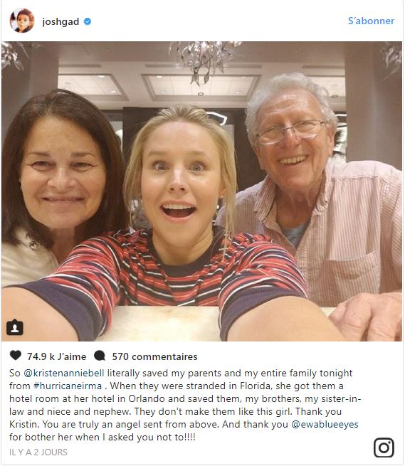 L’actrice américaine de 37 ans Kristen Bell, retenue à Orlando pour le tournage du film “Like Father”, a permis à de nombreuses personnes de trouver refuge au cours du passage de l’ouragan Irma ce week-end. Kristen Bell est venue en aide à la famille de Josh Gad en leur trouvant une chambre dans son hôtel. L’acteur a alors publié sur les réseaux sociaux sa profonde gratitude pour sa consœur : “Kristen Bell a littéralement sauvé mes parents, mon frère et ma famille toute entière. Tu es vraiment un ange descendu sur Terre. Je t’adore”. La nouvelle s’est repandue très vite sur les réseaux sociaux et d’autres stars ont fait appel à l’aide de Kristen Bell. L’actrice a ainsi permis à la grand-mère de 82 ans et à la tante de la star Jennifer Carpenter de trouver refuge. Les deux femmes piégées dans un placard dans la ville de Tampa ont finalement été mises à l’abri grâce à la générosité de Kristen Bell. Une star hollywoodienne devenue héroïne au grand coeur lors du passage de la tempête.