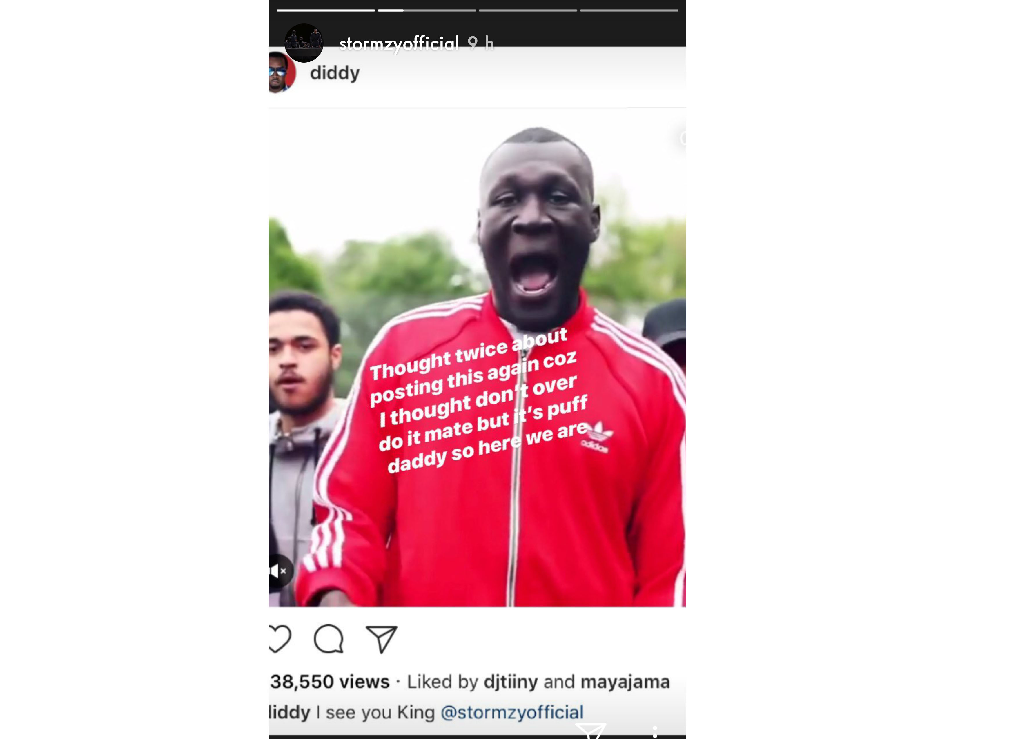 La grime de 24 ans chanteur a posté une capture d'écran du poste Instagram de nul autre que rappeur super star P Diddy qui a posté la vidéo de Stormzy chantant son hit SHUT UP sur son propre compte Instagram officiel, avec le légende, 'Je te vois King @stormzyofficial'