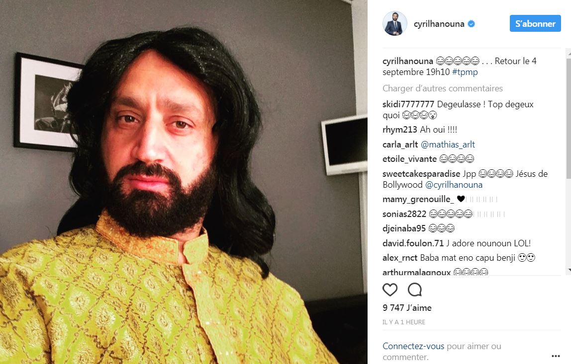 Cyril Hanouna a donné le ton en partageant mercredi 30 août sur les réseaux sociaux la bande-annonce officielle de TPMP. Dans la vidéo, le présentateur s’est amusé à se déguiser en Neymar. Si l’animateur s’était entièrement relooké pour ressembler à l’attaquant du PSG, il semblerait qu’il est encore testé un nouveau look ! Ce vendredi, il a posté sur son compte Instagram un cliché où il a revêtu une longue perruque brune et porte visiblement une tunique traditionnelle orientale. Un relooking qui l’a visiblement autant amusé que ses fans. Si certains ont ri de cette transformation, d’autres ont moins apprécié les cheveux longs comme le révèlent les commentaires. Quelles surprises nous réserve-t-il pour la rentrée de TPMP ?