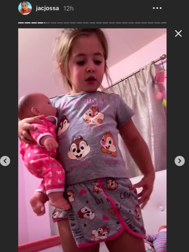 And as Dan had some boy’s time with Freddy on Friday evening, Jacqueline had an eventful ‘girls night’ with their daughters, sharing hilarious video clips to her Instagram story of Mia practising her big sister duties with her plastic ‘baby’ doll.