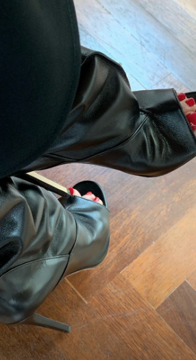 En un clin d'œil, on peut voir les ongles peints en rouge de la star piquer à travers ses talons en similicuir noir.