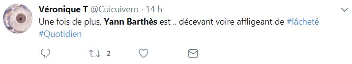 Yann Barthès s’est également attiré les foudres des internautes. Sur Twitter, ils ont reproché au présentateur de “Quotidien” de ne pas avoir suffisamment réagi aux propos de Catherine Millet. “Ça va Yann Barthès, à quand une interview mielleuse de Weinstein et cie au point où vous en êtes”, “une fois de plus Yann Barthès est décevant voire affligeant de lâcheté”, “Sors de ta bulle, viens dans la vraie vie et tais-toi à jamais Catherine Millet. C’est honteux. Yann Barthès pas de connivence avec ce type de pensées stp ! Fais ton job ! “, peut-on lire sur Twitter. Ce vendredi, l’équipe de Quotidien doit recevoir des féministes qui s’opposent aux signataires de la tribune du 9 janvier.