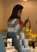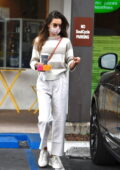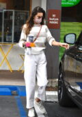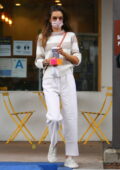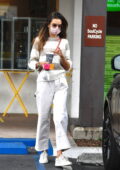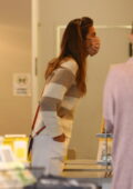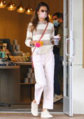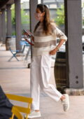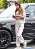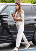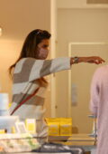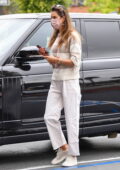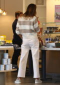 Alessandra Ambrosio a l’air chic avec désinvolture dans un pull rayé et un pantalon blanc en passant par Caffe Luxxe à Brentwood, en Californie
