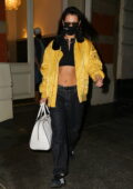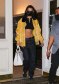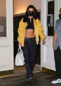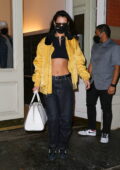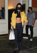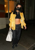 Bella Hadid affiche ses abdos tendus dans un crop top noir et une veste Levi’s jaune vif alors qu’elle sort à New York