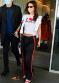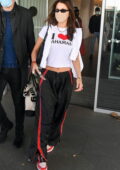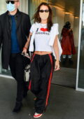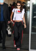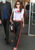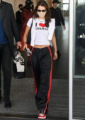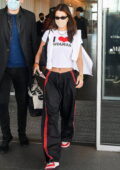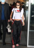 Bella Hadid montre des abdos dans un t-shirt court alors qu’elle atterrit à l’aéroport de Malpensa à Milan, Italie