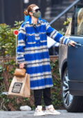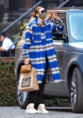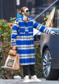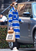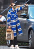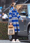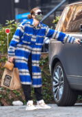 Gigi Hadid a l’air frappante dans un manteau à carreaux bleu alors qu’elle attrape de la nourriture à emporter dans Shake Shack à New York