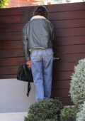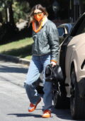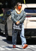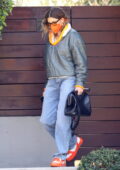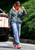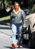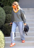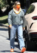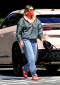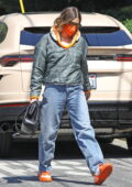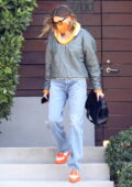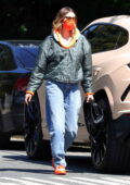 Hailey Bieber porte une veste verte avec un accent orange assorti à son masque et à ses baskets lors d’une visite à un ami à Los Angeles