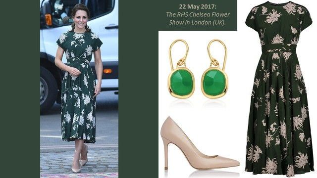 22 mai 2017: Kate, la duchesse de Cambridge, a rejoint la Reine et plusieurs autres membres de la famille royale pour un aperçu de la Chelsea Flower Show sur les terrains du Royal Hospital Chelsea à Londres (Royaume-Uni). Outfit: Rochas Floral Printed Silk Crepe De Chine: Chaussures LK Bennett "Fern" Trench Leather Pumps Bijoux: Monica Vinader Green Onyx Siren Wire Earrings