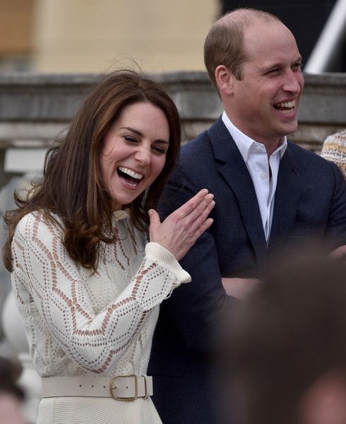 Catherine, la duchesse de Cambridge et le prince William, le duc de Cambridge se moquent alors qu'ils organisent une soirée de thé dans le parc du palais de Buckingham pour honorer les enfants De ceux qui sont morts au service des forces armées le 13 mai 2017 à Londres.