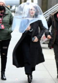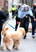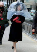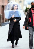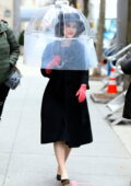 Rachel Brosnahan utilise un parapluie protecteur transparent sur le tournage de “ La merveilleuse Mme Maisel ” à Manhattan, New York City
