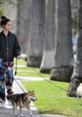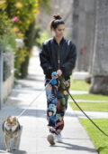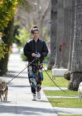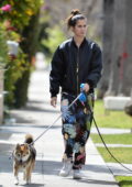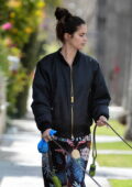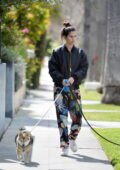 Sara Sampaio porte un blouson aviateur avec un pantalon de jogging coloré alors qu’elle emmène ses chiens se promener à Los Angeles
