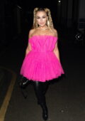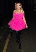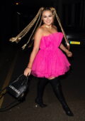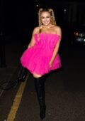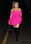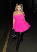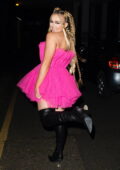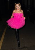 Tallia Storm étourdit en rose alors qu’elle se dirige vers une séance photo en cuissardes à Londres, au Royaume-Uni
